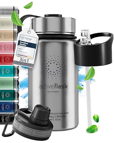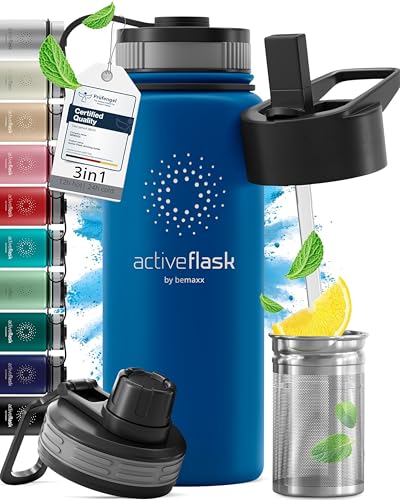 Trinkflasche Edelstahl ACTIVE FLASK + Strohhalm (3 Deckel) BPA-frei, Auslaufsicher, Kohlensäure geeignet - Wasserflasche Fahrrad Thermosflasche Isoliert Isolierflasche Sport Wasser Flasche Kinder Tee