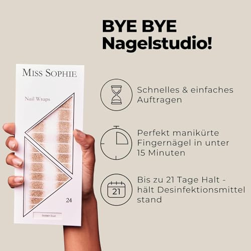 Original Miss Sophie Nagelfolien I 24 ultra-dünne Nagellack-Streifen mit Glitzer Muster in Gold I Für Finger- & Fußnägel I Hält auf Natur- sowie lackierten, Acryl-, Gel- & Shellac-Nägeln
