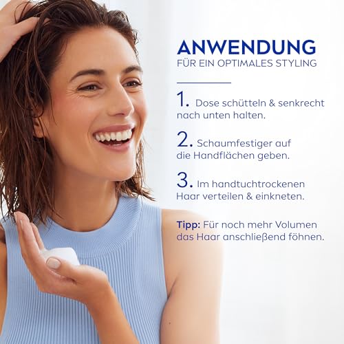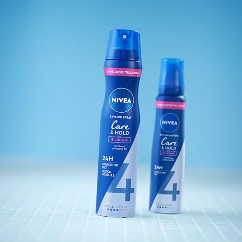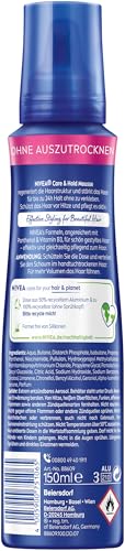 NIVEA Care & Hold Schaumfestiger, pflegender Haarschaum mit Hitzeschutz, Panthenol & Vitamin B3, Haarfestiger für 24h Halt (Haltestufe 4), Styling Mousse (150 ml)