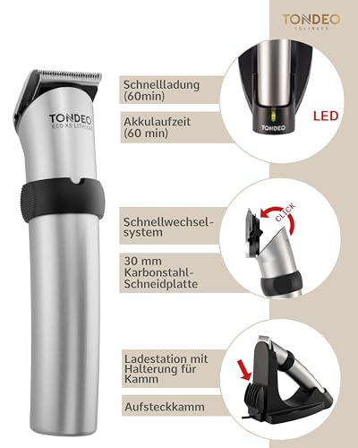 TONDEO Haarschneidemaschine ECO XS LITHIUM SILVER | Barttrimmer Herren inklusive Ladestation und Aufsteckkamm für 5 verschiedene Schnittlängen | Haarschneider für Bart und Konturen