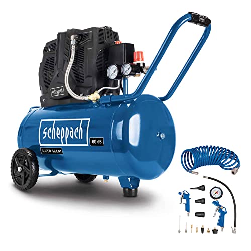 Scheppach HC51Si Super Silent Doppelzylinder Kompressor | 60 dB(A) leise | 50L Kessel | 8bar | ölfrei & wartungsarm | 300 l/min Ansaugleistung | 2 Manometer & Kupplungen | mit 10m Schlauch & Zubehör
