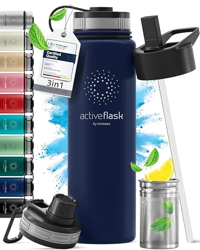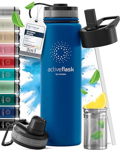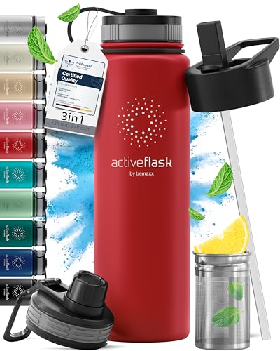 Trinkflasche Edelstahl ACTIVE FLASK + Strohhalm (3 Deckel) BPA-frei, Auslaufsicher, Kohlensäure geeignet - Wasserflasche Fahrrad Thermosflasche Isoliert Isolierflasche Sport Wasser Flasche Kinder Tee