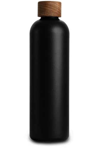 T&N Edelstahl Trinkflasche 1 Liter, Thermosflasche 1l mit Akazienholz Deckel, Isolierte Wasserflasche auslaufsicher bei Kohlensäure, Isolierflasche 1000ml - Anthrazit