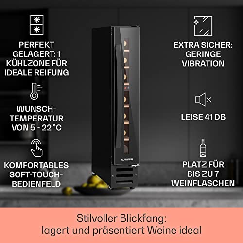 Klarstein Weinkühlschrank, 1 Zonen Getränkekühlschrank, Kleiner Einbau-Weinschrank Schmal, 20L Wein-Kühlschrank mit Glastür, Indoor/Outdoor Flaschenkühlschrank, Wine Fridge 5-22°C, 7 Flaschen
