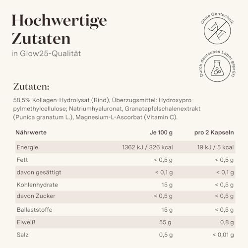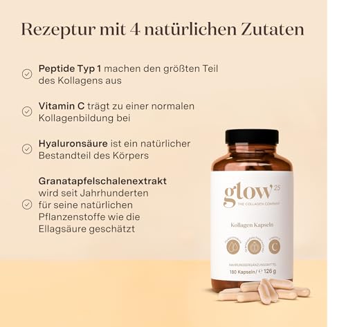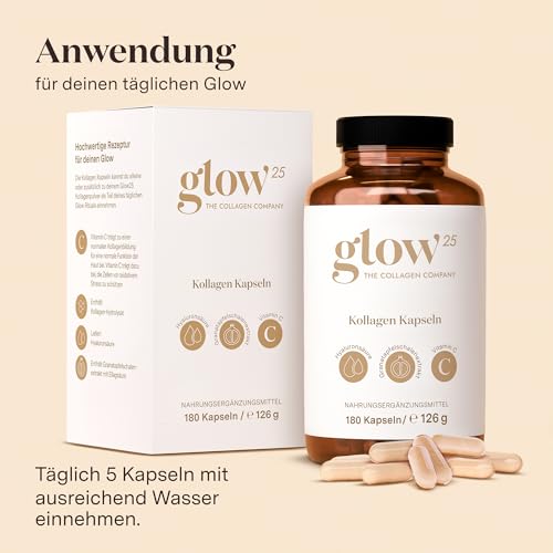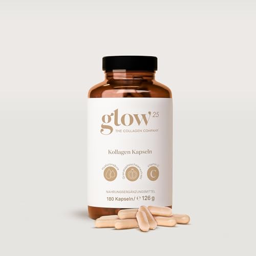 Glow25® Kollagen Kapseln hochdosiert [180 Kapseln] mit Hyaluronsäure und Vitamin C | Premium Collagen Complex | Laborgeprüft