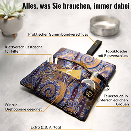 GUGGIARI® Tabaktasche für 30/50g - Drehtasche mit Funktionsfächern aus Stoff mit Filterfach & Blättchen-Halter & Feuerzeug – Tabakbeutel (Bohemian Tobacco)