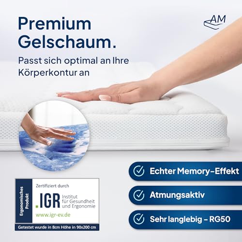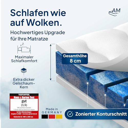 AM Qualitätsmatratzen 7 Zonen Deluxe Gel Topper 80x200cm RG50 - Made in Germany - Atmungsaktiver Gelschaum Topper 80x200-8cm - Kühlende Matratzenauflage mit Lyocell Bezug und Anti-Rutsch Funktion
