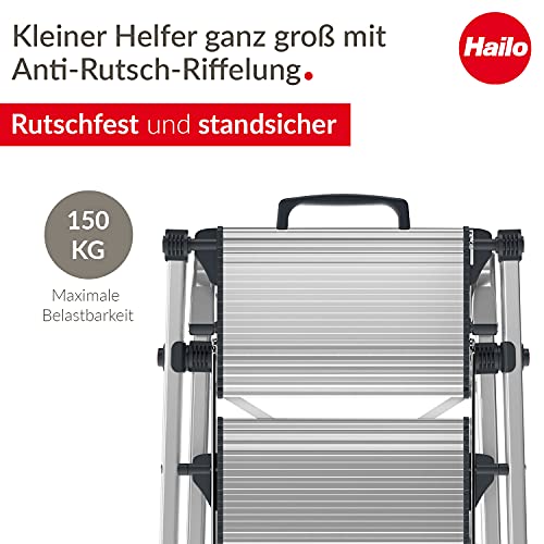 Hailo MK80 ComfortLine Alu-Klapptritt-Leiter - 2 große Stufen bis 150 kg - Komfort-Trittleiter mit Tragegriff mit integrierter Entriegelungsfunktion - Füße mit Soft-Grip-Sohle - rostfrei - Silber