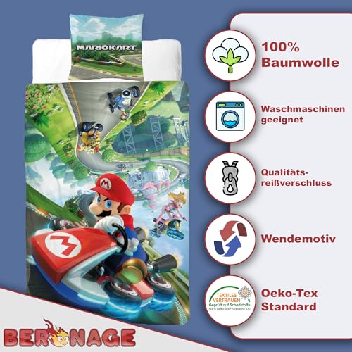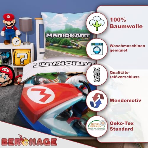 BERONAGE Super Mario Kart Kinderbettwäsche Combo - 135 x 200 cm + 80 x 80 cm – 100% Baumwolle Renforcé-Linon – Bettwäsche mit Motiven von Mario, Bowser & Co. - Rennen - Reißverschluss, deutsche Größe
