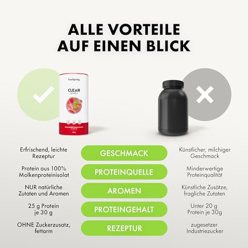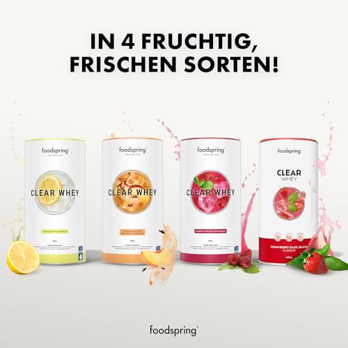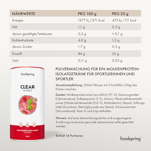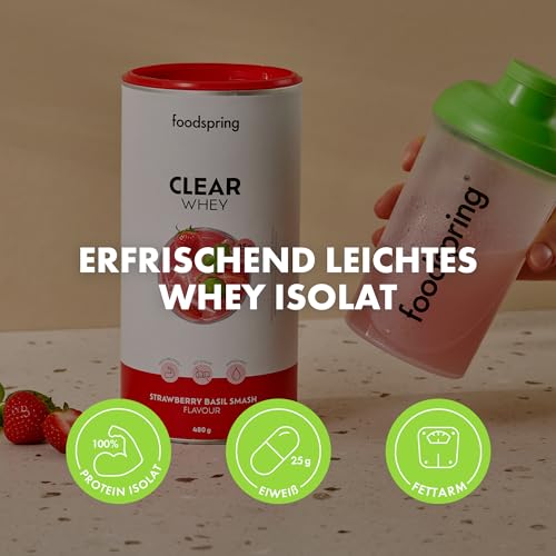 foodspring - Clear Whey Protein Strawberry Basil Smash Geschmack - Isoclear Whey 480g zuckerfrei & 25g Protein pro Portion - Erfrischender Proteinshake aus premium Whey-Isolat - Ideal für Post Workout
