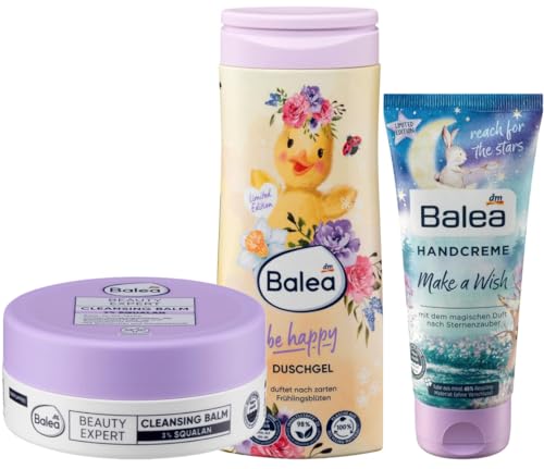 Balea 3er-Set Hautpflege: Reinigungsmousse Beauty Expert CLEANSING BALM (100 ml) + Cremedusche BE HAPPY Duschgel mit Duft nach zarten Frühlingsblüten (300 ml) + Handcreme MAKE A WISH (100 ml), 500 ml