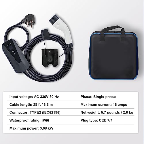 VEVOR Tragbares EV-Ladegerät mit LCD-Display 3,68 kW Ladegerät für Elektrofahrzeuge EV-Ladekabel Typ 2(IEC62196) CEE 7/7 Stecker 16A 1-Phasig EV-Ladestation 8,6m Kabellänge IP66 Wasserdicht Wallbox