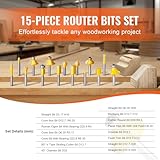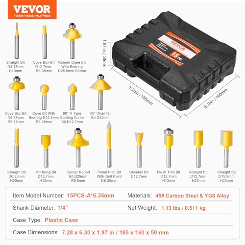 VEVOR Fräser-Set, 15-teilig, Oberfräser-Set mit 1/4-Zoll-Schaft, Kunststoff-Tragekoffer, Holzbearbeitungswerkzeuge für professionelle und Anfänger-Schreiner, für Holz, MDF, Spanplatten, Sperrholz